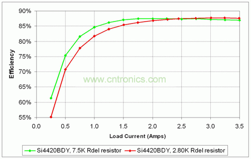 圖 8 顯示了有源鉗位電路中兩種不同的延遲設置,以及它們是如何影響不同負載條件下的效率的。由較大 Rdel 電阻值編程獲得的較長延遲時間降低了輕負載直通損耗,從而極大地提高了輕負載效率。但是,這種長延遲時間同時也增加了同步 MOSFET 主體二極管的傳導時間,使滿負載條件時的效率降低了 1% 左右。使用較低值 Rdel 后,滿負載同步 MOSFET 主體二極管傳導損耗在直通損耗中占主導地位。在某些情況下,人們也許必須經由選取合適的 Rdel 值來選擇是使輕負載效率最大化,還是讓最大負載效率最大化。圖 9 所示的有源鉗位反向電源運用了所有這些效率提升方法。這種結構使最大負載的效率提高大約 10%,并且擁有和原始二極管整流設計差不多一樣的輕負載效率性能。[page]