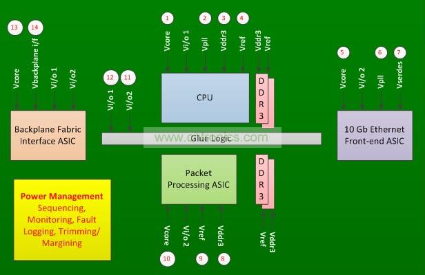 在圖1所示的線卡中,有四個(gè)主要的集成電路和一些粘合邏輯。每個(gè)集成電路都需要多個(gè)電源,并有定序的要求。這塊電路板有14個(gè)電源電壓,需要進(jìn)行監(jiān)測、定序、微調(diào)和裕度調(diào)整。此外,電路板的設(shè)計(jì)還需要將任何意想不到的電源故障記錄在非易失性存儲(chǔ)器中。