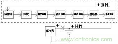 如圖2圖3示 ,合閘母線(+HM)經(jīng)過硅降壓回路降壓后,形成正控制母線(+KM),+KM經(jīng)自動調(diào)壓回路采樣后,采樣值送到比較判斷回路,在此處進行比較。如果+KM沒有高于預先設好的范圍,則觸發(fā)電路不動作。移位執(zhí)行電路也不動作,相應的繼電器也不動,電路保持原狀態(tài),+KM值保持不變,如果+KM超出了預先設好的范圍,則比較判斷回路發(fā)出信號,告之觸發(fā)電路,觸發(fā)電路立即發(fā)出脈沖,觸發(fā)移位寄存器,移位寄存器開始向左或向右執(zhí)行移位,從而使電路驅動繼電器動作。繼電器相應的節(jié)點打開或閉和,來實現(xiàn)硅二極管是串入還是脫離+KM回路,于是實現(xiàn)+KM按電力標準規(guī)定的范圍內(nèi)變化,從而實現(xiàn)了自動調(diào)節(jié)+KM電壓。