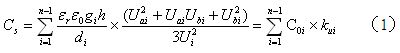 式中,為第層與+1層線圈之間的靜態電容,= 1、2、3、• • •、n ,n為所求總分布電容的變壓器初級線圈或次級線圈的層數;為第層與+1層線圈之間的平均周長;為第層與+1層線圈之間分布電容的動態系數,,它與加到電容兩端的電壓有關,是一個小于1的系數;