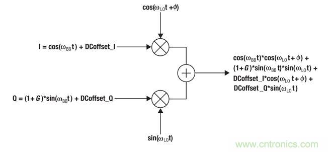 DC 偏移會(huì)與 LO 混頻,產(chǎn)生 LO 饋通,即?LO的頻率。I和Q分支的DC偏移加入正交,形成以下的LO饋通振幅: