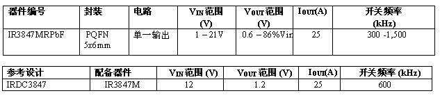 IR3847采用纖巧的PQFN 5×6mm 封裝,為15A 至 25A應用帶來市場領先的電氣性能和熱性能,比如可以實現超過96%的尖峰效率,在25A下溫度僅上升50°C等。新器件的其它增強性能還包括外同步、排序、VTT跟蹤和輸出電壓極限。