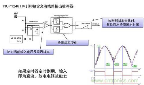 為了符合安規(guī)標準,AC-DC電源必須具備在撥出交流插頭后不到1秒時間內將電磁干擾(EMI)濾波器X2輸入電容放電的能力。為了符合此要求,常使用與電容并聯的一串高阻抗電阻,但是,電阻型消耗源 (drain)消耗約25 mW輸入能耗,當考慮到空載輸入能耗時,此25 mW能耗相對較大。安森美半導體的方案采用有源X2電容放電來檢測斷開交流連接狀況,并通過開關觸發(fā)電容放電。NCP1246 HV引腳包含了交流線路撥出檢測器,如果定時器定時到期,輸入即為直流,放電電路被觸發(fā),X2電容放電,見圖2。