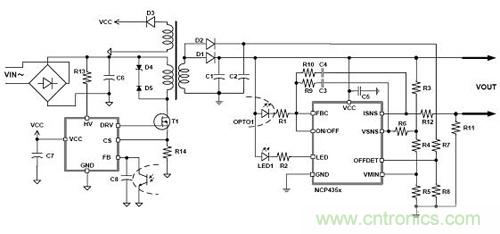 NCP4354是專為與NCP1246配合使用而設計的一款低待機能耗次級端恒流恒壓 (CCCV) 控制器,帶有LED驅動器 (圖3)。其價值在于,可檢測空載條件并使主控制器進入超低頻率跳周期模式,以降低待機功耗;只有一個反饋和關閉(OFF)控制所需的光耦;提高了空載效率(小于15 mW);元件更少。此外,它還具有CCCV反饋和LED驅動器、供電電壓高達36 V、在關機模式可調整最低Vout、1.25 V參考精度為1%,以及Icc大于100 μA等特性。NCP4354與NCP1246一起使用,可調節(jié)Vmin,市場及應用范圍包括筆記本電腦適配器及其他外部電源適配器。NCP435x系列還有一款不帶LED驅動器的產品NCP4353,可以與NCP1246一起使用來調節(jié)Vmin(僅B版本)。