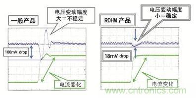 參見表1。基本上,兩種產(chǎn)品都是高效同步整流的降壓型控制器,不僅在重負載時的效率高,輕負載時的效率也很高。標準電壓為0.75V/0.7V,適用低電壓,±1%的精度對于前述的±3%的精度來說具有充分的余量。不僅如此,通過ROHM獨創(chuàng)的H3RegTM控制模式實現(xiàn)了高速負載瞬態(tài)響應(圖4),非常適合用作FPGA電源。