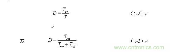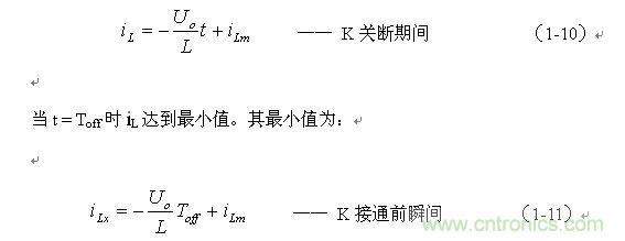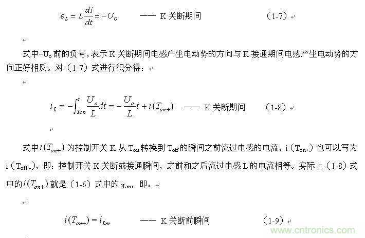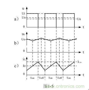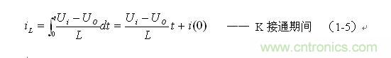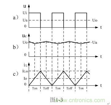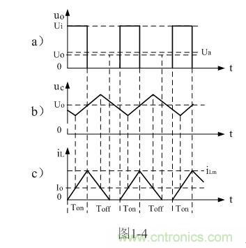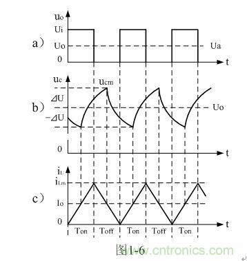 在此順便說明:由于電容兩端的電壓變化量ΔU相對于輸出電壓Uo來說非常小,為了簡單,我們這里把Uo當(dāng)成常量來處理。在某種情況下,當(dāng)我們需要對電容的初次充、放電過程進(jìn)行分析時,必須需要建立微分方程,并求解。當(dāng)開關(guān)電源剛開始工作時,由于輸出電壓Uo的建立需要一定的時間,因此,輸出電壓Uo的建立也需要一個過渡過程,如對此過渡過程進(jìn)行精確計(jì)算,得出的結(jié)果中一般都含有一指數(shù)函數(shù)項(xiàng),當(dāng)令時間變量等于無窮大時,即電路進(jìn)入穩(wěn)態(tài)時,再對相關(guān)參量取平均值,其結(jié)果就基本與(1-4)相等。