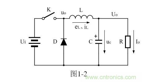 圖1-2中的C是儲能濾波電容,它的作用是在控制開關(guān)K接通期間Ton把流過儲能電感L的部分電流轉(zhuǎn)化成電荷進(jìn)行存儲,然后在控制開關(guān)K關(guān)斷期間Toff把電荷轉(zhuǎn)化成電流繼續(xù)向負(fù)載R提供能量輸出,它對電感L的輸出電壓起到平滑濾波的作用,使輸出到負(fù)載兩端電壓的紋波降低。