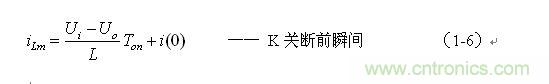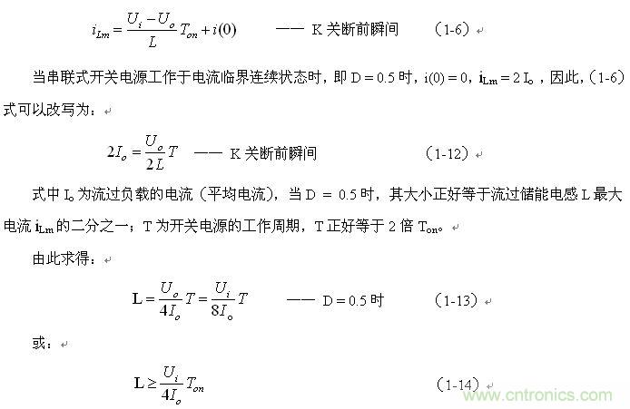串聯(lián)式開關(guān)電源最好工作于電流臨界連續(xù)狀態(tài),或連續(xù)電流狀態(tài)。此時,開關(guān)電源輸出電壓的調(diào)整率為最好,且輸出電壓Uo的紋波也不大。因此,我們可以從電流臨界連續(xù)狀態(tài)著手進(jìn)行分析。我們先看(1-6)式: