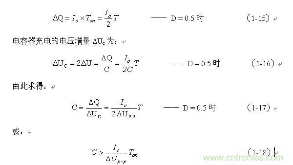 同理,(1-17)和(1-18)式的計(jì)算結(jié)果,只給出了計(jì)算串聯(lián)式開關(guān)電源儲能濾波電容C的中間值,或平均值,由于輸出電流的不確定性,實(shí)際應(yīng)用時,可以以此為極限,在此平均值的計(jì)算結(jié)果上再乘以一個大于1的系數(shù)。