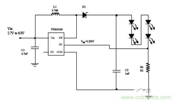 圖 中的升壓轉(zhuǎn)換器被配置為一個(gè)可驅(qū)動 4白光 LED 的電流源。該器件將檢測電阻器 Rs 兩端的電壓調(diào)節(jié)至 1.233V,從而得到一個(gè)定義的 LED 電流。
