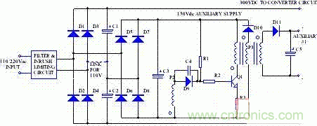 這個(gè)輔助電源適合于110/220Vac輸入。開始時(shí)由于通過R1、R2的基級(jí)驅(qū)動(dòng)電流,Q1開始導(dǎo)通,繞組P2上的反饋電壓將加速Q(mào)1的開通過程。隨著Q1的導(dǎo)通,初級(jí)線圈P1上的電流將線性增加,而R3上的電流也線性增加,Q發(fā)射級(jí)電壓增加,導(dǎo)致R2上的電流減小,Q1開始關(guān)斷。由于P2上的反饋電壓方向,所以將加速Q(mào)1的關(guān)斷過程。在反激階段,繞組P3和D10把反激的大部分能量回饋到輸入,只有一小部分能量通過D11傳送到輸出。根據(jù)變壓器鐵芯選擇適當(dāng)?shù)某跫?jí)線圈,使得在Q1開通階段儲(chǔ)存的能量至少是所需輔助輸出能量的3-4倍,這樣二極管D10在反激階段始終導(dǎo)通,次級(jí)電壓就完全由初級(jí)電壓和砸數(shù)比決定,這樣做的好處是易于設(shè)定輔助電源的輸出電壓。