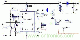 這是一個(gè)由UC3842構(gòu)成的反激式小型開關(guān)電源,它的輔助電源由主變換器變壓器一個(gè)繞組提供。在啟動(dòng)階段,由直流輸入端經(jīng)過電阻分壓后加到UC3842的供電端(7端),給電容C2充電,等到UC3842的7腳電壓超過16V時(shí),芯片起振,PWM信號(hào)產(chǎn)生,變換器工作,輔助電源電壓開始建立。但由于限流電阻RIN的作用,有可能使得芯片7腳電壓降低至10V而使得芯片停止工作。之后主電路又通過RIN電阻給UC3842芯片供電,芯片工作。如此反復(fù),直至芯片正常工作所需的輔助電源電壓建立后,電源才正常工作。