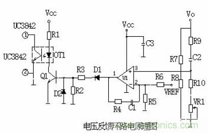 當輸出U0升高,經取樣電阻R7、R8、R10、VR1分壓后,U1③腳電壓升高,當其超過U1②腳基準電壓后U1①腳輸出高電平,使Q1導通,光耦OT1發(fā)光二極管發(fā)光,光電三極管導通,UC3842①腳電位相應變低,從而改變U1⑥腳輸出占空比減小,U0降低。