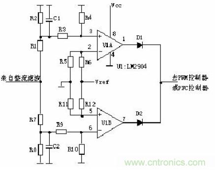 取樣電壓分為兩路,一路經R1、R2、R3、R4分壓后輸入比較器3腳,如取樣電壓高于2腳基準電壓,比較器1腳輸出高電平去控制主控制器使其關斷,電源無輸出。另一路經R7、R8、R9、R10分壓后輸入比較器6腳,如取樣電壓低于5腳基準電壓,比較器7腳輸出高電平去控制主控制器使其關斷,電源無輸出。