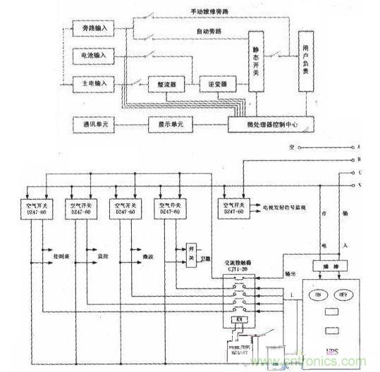 解決UPS短暫斷電問題,對其進行了技術改造,新增UPS電源供電,并對原有供電系統(tǒng)的控制部分進行升級。新增UPS電源為 美國山特CASTLE系列C3K型在線式不間斷電源。在線式UPS的運作模式為市電和用電設備是隔離的,市電不會直接供電給用電設備,而是通過UPS轉換 成直流電,再兵分兩路,一路為電池充電,另一路則轉回交流電,供電給用電設備,市電供電品質不穩(wěn)或停電時,電池從充電轉為供電,直到市電恢復正常才轉回充 電,UPS在用電的整個過程是全程介入的。