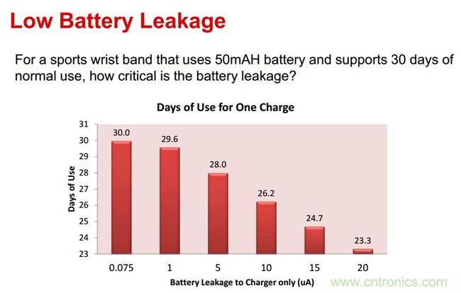 演講中,文博士還提到,可穿戴設備對于電池模塊的尺寸要求很小,對于電池精度的要求卻是日益提高,如何實現較小的充電終止電流,也是目前急需攻克的難題之一。“基于較小尺寸和充電終止電流的需求,TI推出了為可穿戴設備等低功耗應用量身定制的鋰離子電池充電器:Bq25100。”文博士為我們介紹道,Bq25100采用了0.9×1.6毫米的WCSP封裝,可支持尺寸僅為前代一半的充電器解決方案;Bq25100可以對低至10mA或高達250mA的快速充電電流進行準確控制,同時還可實現低至1mA的充電終止,從而支持微型鋰離子紐扣電池。此外,Bq25100還支持不足75nA的漏電流,可解決因漏電流帶來的電池損耗問題,延長電池使用時間。