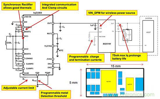所幸的是,無線充電并沒有那么大的技術障礙,市面上已經有了很多可行的方案出現,當前TI也順勢推出了適用于可穿戴設備的無線充電解決方案,在該方案的接收模塊上,我們可以看到除了應用了上述所提及的降壓轉換器Bq25100外,還加入了基于Qi標準的無線充電接收器——BQ51003($1.4625)。