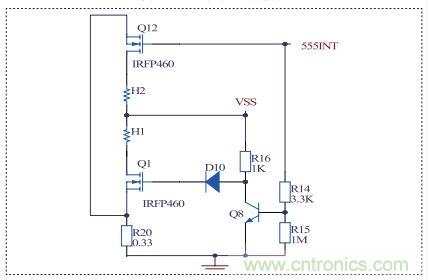 主要把NE555D產生的一個36.7KHZ的脈沖功率放大,經發射線圈發射出去。當脈沖為高電平時,Q12柵極為高電平,Q12導通,此時Q8飽和,Uceq電壓只有0.67V,經D10-4148后Q1柵極電壓為0,Q1截止。當脈沖為低電平時,Q8、Q12同時截止,電流直接由R16 D10 Q1,Q1導通。整個過程中Q1與Q12均以一開一關的形式工作。電路如圖2: