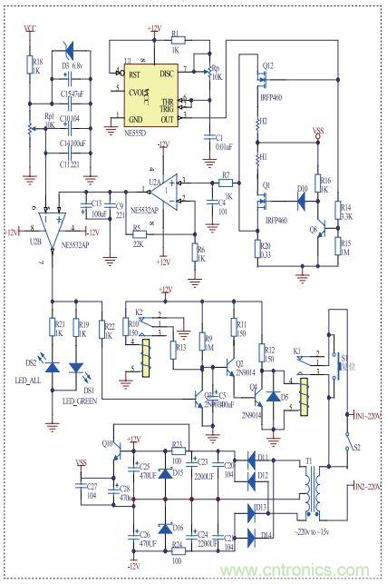 斷電后,繼電器K2閉合,此時C5與R13構成RC放電電路,給C5快速放電。當按一下輕觸復位開關時,充電器重新啟動。當感應負載充滿電(或無感應負載)時,電容C5充電,其電壓為Ut 由公式Ut=12*(1-e-t/R9C5)得:t=-R9C5ln(1-Ut/12) 其中C5=100UF,R9=1MΩ,Ut=1.34V, 經計算得斷電時間:t=10S 實現了10秒自動斷電。在綠燈亮的10秒內只要有感應負載,則Ui為高電平,Q3飽和,電容C5放電。整個充電過程實現智能化斷電。