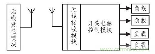 本系統(tǒng)由無線發(fā)送模塊、無線接受模塊和開關(guān)電源控制模塊3部分組成,其系統(tǒng)構(gòu)成如圖1所示。