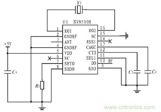 無線接收部分主要由解碼芯片SYN500R、晶振和外圍電路組成超外差接收模塊,接收模塊負(fù)責(zé)接收來自發(fā)送模塊的編碼,然后將編碼交由處理器處理,處理器處理后通過放大器將信號放大,然后控制繼電器的開和合,接收部分電路圖如圖4所示。