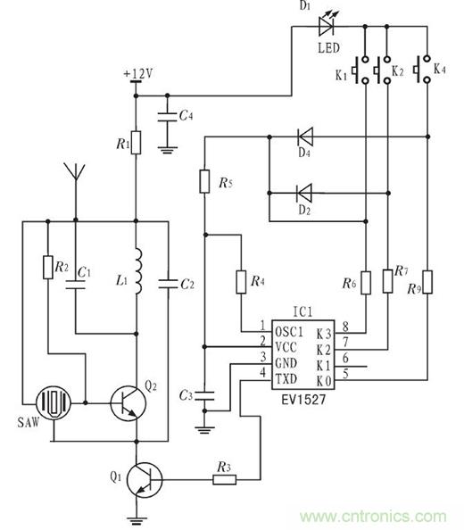 發(fā)送模塊主要由HS1527($1056.0000)無線發(fā)碼芯片、聲表面濾波器、指示燈及濾波電路等組成,發(fā)送模塊作為遙控器來操作,電路圖如圖2所示。當(dāng)按下不同的按鍵K時(shí),發(fā)碼芯片就會通過天線發(fā)出不同的編碼,編碼經(jīng)過天線發(fā)送到接收模塊由接收模塊將編碼交由控制模塊解析處理,發(fā)送模塊供電電壓12 V,由電池供電。
