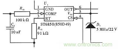 如圖4所示,電路通過T1、D7獲取穩定的22 V電壓,供給芯片工作,芯片通過2號引腳進行取樣輸入,C4對電路的頻率和電壓進行控制。