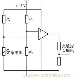 其由光電轉換模塊和光敏電阻組成。光電轉換由比較器來實現。當光敏探頭感應的光照強度不強時,比較器會輸出高電位,否則輸出低電位。具體電路如圖6所示。R1分擔電路電壓,依照外界環境條件,選擇適當的電阻R2,控制比較器中正相輸入的電壓值,使其作為比較器工作的參考電壓;R3起到保護光敏電阻以及分壓的作用。光敏電阻的阻值隨著外界光強的變化而變化,這樣就可將光信號變換成電壓信號,以此作為信號電壓連接到比較器的反相輸入端。比較兩個輸入端的電壓大小。若信號電壓較小,比較器輸出高電平,否則比較器輸出低電平。從而實現在明亮條件下輸出低電平,在黑暗條件下輸出高電平的設計要求。