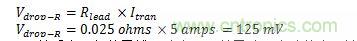 以一個具有25A供電,伴有5A瞬變電流的負載應用為例。其中,電源電壓設為 2.5V,通過5英尺長的14AWG布線連接至IC測試板。由于是低電壓供電,如果電壓有超過100mV的跌落,通常是不可接受的。14AWG線每英尺的電阻為2.5mΩ,由此,在電源輸出和IC測試板之間的導線回路存在25mΩ電阻。根據歐姆定律,我們可以計算出導向回路上可能出現的壓降: