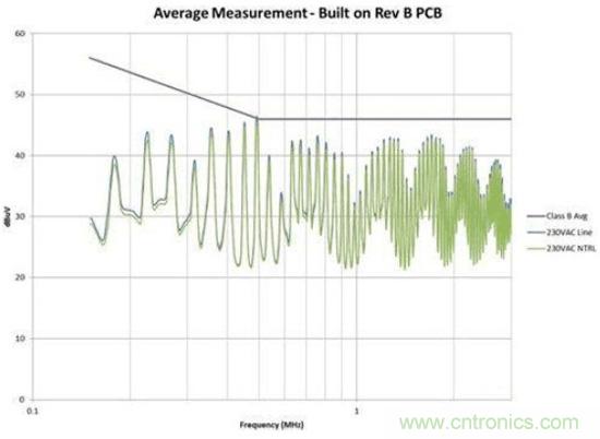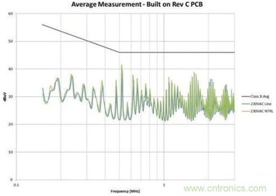 圖4是修改后的效果圖。我們在故障點(diǎn)位置為EMI規(guī)范獲得了大約6dB的裕量。此外,我們還顯著減少了總體EMI簽名。所有這些改善都僅僅是因?yàn)椴季值恼{(diào)整,并未改變電路。如果您的電路具有高電壓開關(guān)并使用了屏蔽距離,您需要非常小心地對其進(jìn)行控制。