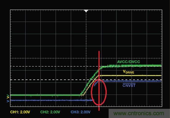 在所有電源均完全建立之前,不得切換數(shù)字引腳。對(duì)于SAR ADC,轉(zhuǎn)換開(kāi)始引腳CNVST 可能對(duì)噪聲敏感。在圖1 所示示例中,當(dāng)AVCC、DVCC 和VDRIVE 仍在上升時(shí),主機(jī)cPLD 拉高CNVST。這可能使 AD7367 進(jìn)入未知狀態(tài),因此,在電源完全建立之前,主機(jī)應(yīng)使 CNVST 保持低電平。