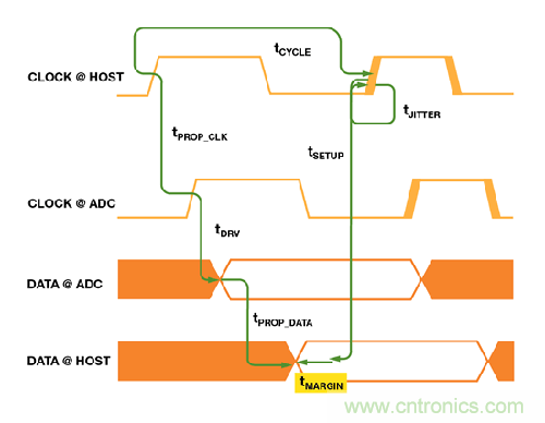 tPROP_CLK: 從主機(jī)到ADC 的傳輸線路的數(shù)據(jù)傳播延遲