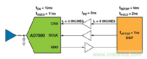 在圖4 中,DSP 主機(jī)訪問(wèn) AD7980 處于3 線 CS 模式下,其中,VIO = 3.3 V。DSP 鎖存SCLK 下降沿上的SDO 信號(hào)。DSP 的額定最小建立時(shí)間為5 ns,最小保持時(shí)間為2 ns。對(duì)于典型的FR-4PCB 板,傳播延遲約為180 ps/in。緩沖器的傳播延遲為5 ns。CNV、SCLK 和SDO 的總傳播延遲為