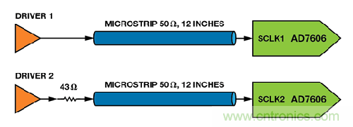 在圖7 中,一個(gè)驅(qū)動(dòng)器通過(guò)一條12 英寸的微帶線路連接SCLK1,另一個(gè)驅(qū)動(dòng)器通過(guò)一個(gè)與微帶串聯(lián)的43 Ω 電阻連接SCLK2。