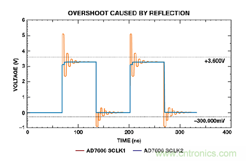 在圖8 中,SCLK1 上的大過(guò)沖違反了–0.3 V 至+3.6 V 的絕對(duì)最大額定值。串聯(lián)電阻可減小SCLK2 上的壓擺率,使信號(hào)處于額定值之內(nèi)。