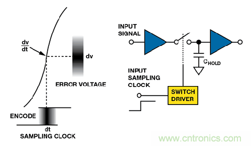 孔徑或采樣時(shí)鐘抖動(dòng)設(shè)定SNR 限值,尤其是對(duì)高頻輸入信號(hào)。系統(tǒng)抖動(dòng)有兩個(gè)來(lái)源:來(lái)自片內(nèi)采樣保持電路的孔徑抖動(dòng)(內(nèi)部抖動(dòng)),以及采樣時(shí)鐘上的抖動(dòng)(外部抖動(dòng))。孔徑抖動(dòng)為轉(zhuǎn)換間的 采樣時(shí)間變化,為ADC 的函數(shù)。采樣時(shí)鐘抖動(dòng)通常為主要誤差源,但兩個(gè)源都會(huì)導(dǎo)致模擬輸入采樣時(shí)間變化,如圖9所示。它們的影響難以區(qū)分。