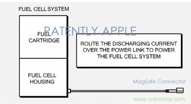 在這種專利一種可能的實施方案中,蘋果的燃料電池,可以作為一個獨立的供電模塊,通過MagSafe連接線纜和蘋果筆記本電腦連接。不過蘋果也表示,這種供電設備可以采用市面上的其他線纜,除了供電之外,線纜還可以作為電子設備和燃料電池之間的通信管道。