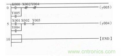在圖3梯形圖中,PLC外部按鈕所控制的常開觸點(diǎn)主要是左母線的第一等級以及第二等級的X001觸點(diǎn)和X002觸點(diǎn),只需按鈕便可使得X000或X001任意一個(gè)常開觸點(diǎn)閉合,輸出繼電器Y005或繼電器Y004就能通過相應(yīng)線路形成閉合回路,進(jìn)而使常開接觸點(diǎn)Y005或Y004實(shí)現(xiàn)自鎖功能同時(shí)實(shí)現(xiàn)電動(dòng)機(jī)的正反轉(zhuǎn)。停止通過PLC外部的按鈕實(shí)現(xiàn),按鈕通過釋放X002常開接觸點(diǎn),使得繼電器斷電引發(fā)電動(dòng)機(jī)停止運(yùn)轉(zhuǎn)。
