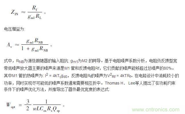 ③ M1 的溝道熱噪聲被反饋電路降低,在寬頻帶范圍內實現噪聲系數NF<3. 6 dB。通過分析小信號模型和噪聲系數,得到該結構的輸入阻抗為: