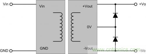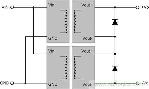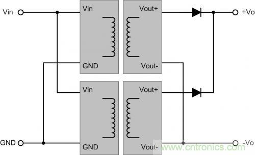 如一個5V轉(zhuǎn)±12V的電源,若臨時需要5V轉(zhuǎn)24V,可把負(fù)當(dāng)?shù)兀敵霎?dāng)24V電源,輸出24VDC。應(yīng)用時,在輸出各方向并聯(lián)一個二極管續(xù)流,防止兩路啟動時間不同,由一路通過負(fù)載給另一路的內(nèi)部電路充電。