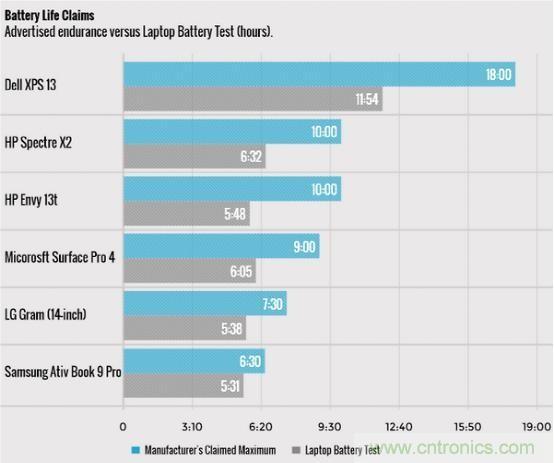通過上圖可以看到,其中差異最大的戴爾XPS 13,宣稱電池壽命與實際相差近6小時,令人咋舌。差異最小的機型為三星Ativ Book 9 Pro,為30分鐘,但其本身電池壽命就不長。而其他機型的差異,普遍在3小時以上。需要指出的是,電池測試并不能完全代表現(xiàn)實環(huán)境。比如,測試時的屏幕亮度約為100尼特,但實際使用中我們基本上都會把亮度調(diào)至更高;另外測試軟件模擬的計算機應(yīng)用形式實際上比較單一,比如連續(xù)視頻播放、觀看網(wǎng)頁等等,但你在現(xiàn)實中往往會進行更復(fù)雜的多任務(wù)。也就是說,你可能會發(fā)現(xiàn)筆記本電腦續(xù)航時間比媒體測試的時間更短。