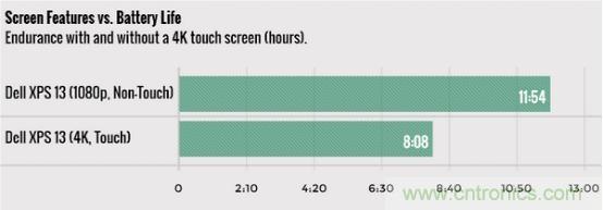 拋開電池技術(shù)本身止步不前的原因,筆記本電腦電池壽命沒有進步的主要原因在于其他硬件發(fā)展。雖然處理器每一年都在功耗方面擁有一定進步,但4K屏幕、觸摸屏、超輕薄設(shè)計,對電池壽命都產(chǎn)生了消極的影響。以戴爾XPS 13為例,1080P非觸摸屏版本相比4K觸摸屏版本的電池壽命長了約4小時。