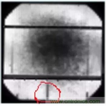 給晶硅組件施加電壓后,所激發出的電子和空穴復合的數量越多,其發射出的光子也就越多,所測得的EL圖像也就越亮;如果有的區域EL圖像比較暗,說明該處產生的電子和空穴數量較少(例如圖3中電池中部),代表該處存在缺陷(復合中心);如果有的區域完全是暗的,代表該處沒有發生電子和空穴的復合(圖3和圖4中紅線所標處),也或者是所發光被其它障礙所遮擋(圖3和圖4主柵線處),無法檢測到信號。