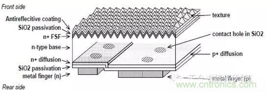 IBC電池的常見結構如圖2所示。在高壽命的N型硅片襯底的背面形成相間的P+和N+擴散區,前表面制備金字塔狀絨面來增強光的吸收,同時在前表面形成前表面場(FSF)。前表面多采用SiNx的疊層鈍化減反膜,背面采用SiO2、AlOx、SiNx等鈍化層或疊層。最后在背面選擇性地形成P和N的金屬接觸。