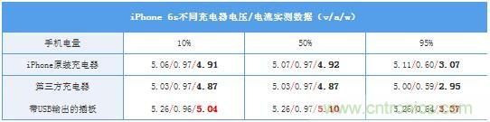 測試方法:使用USB電壓/電流檢測儀進行充電的實時監測,分辨監測6s在10%、50%、95%三個時刻(具體電量略有偏差)的電壓/電流數值。(同一手機在同一剩余電量時對輸入電壓/電流的需求都是一定的,所以只要保證三個時刻讀取的電壓/電流值相似(功率基本一樣),則可認為整體充電時間相差不大。)