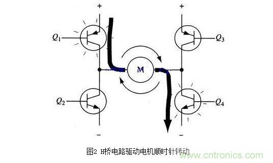 要使電機(jī)運(yùn)轉(zhuǎn),必須使對(duì)角線上的一對(duì)三極管導(dǎo)通。例如,如圖2所示,當(dāng)Q1管和Q4管導(dǎo)通時(shí),電流就從電源正極經(jīng)Q1從左至右穿過電機(jī),然后再經(jīng)Q4回到電源負(fù)極。按圖中電流箭頭所示,該流向的電流將驅(qū)動(dòng)電機(jī)順時(shí)針轉(zhuǎn)動(dòng)。當(dāng)三極管Q1和Q4導(dǎo)通時(shí),電流將從左至右流過電機(jī),從而驅(qū)動(dòng)電機(jī)按特定方向轉(zhuǎn)動(dòng)(電機(jī)周圍的箭頭指示為順時(shí)針方向)。