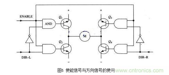 改進(jìn)電路在基本H橋電路的基礎(chǔ)上增加了4個(gè)與門和2個(gè)非門。4個(gè)與門同一個(gè)“使能”導(dǎo)通信號(hào)相接,這樣,用這一個(gè)信號(hào)就能控制整個(gè)電路的開關(guān)。而2個(gè)非門通過提供一種方向輸人,可以保證任何時(shí)候在H橋的同側(cè)腿上都只有一個(gè)三極管能導(dǎo)通。(與本節(jié)前面的示意圖一樣,圖4所示也不是一個(gè)完整的電路圖,特別是圖中與門和三極管直接連接是不能正常工作的。)