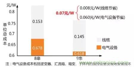 上述分析僅僅是考慮了光照資源,但在實際光伏系統(tǒng)中,由于灰塵遮擋,組件輸出至少降低2-3%,再考慮到組件衰減、電纜損耗等因素,實際傳輸?shù)侥孀兤鬏斎攵说闹绷鞴β视謺p少5-10%左右。此外,根據(jù)1.6MW典型系統(tǒng)設(shè)計方案成本計算表明,50kW組串式逆變器直流側(cè)接9串方案比8串方案,逆變器數(shù)量減少了12%以上,可節(jié)省系統(tǒng)初投資0.07元/W,100MW可節(jié)約初始投資700萬,這便是逆變器較高的“吞”能力帶來的好處,如圖3所示。