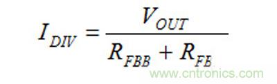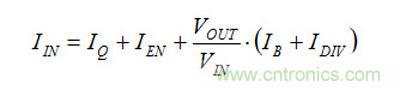 由于這個方程式沒有將轉換器中的損耗算在內,所以它給出的是一個最佳情況下的估算值。第一個被稱為IQ的數據是我在上一部分中談到的非開關式靜態電流。下一個數據項,IEN 是進入穩壓器使能輸入的電流。很多轉換器需要一定大小的偏置電流流入使能輸入。如果使能引腳被連接至輸入電源,以接通穩壓器的話,那么你必須將這個電流考慮在內;否則的話,這個值為零。數據項IDIV 是反饋分頻器內的電流,使用方程式2,可以很容易地計算出這個值: