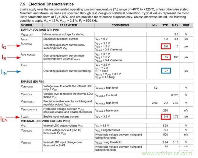 數據項IB 代表流入我剛剛談到的偏置輸入的電流。我們以3.5V至36V,3A同步降壓轉換器SIMPLE SWITCHER? LM43603為例。這個數據表中有以下這些典型值(表1)。